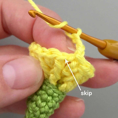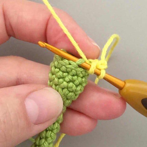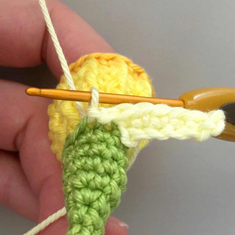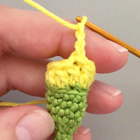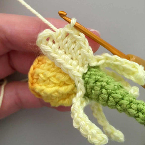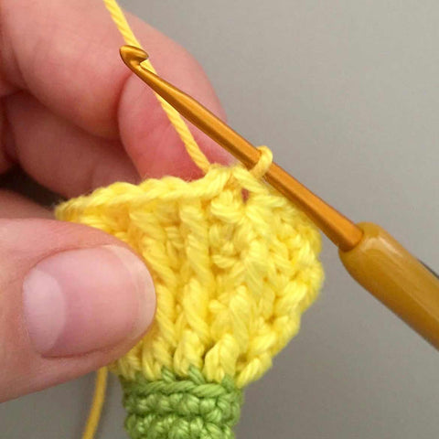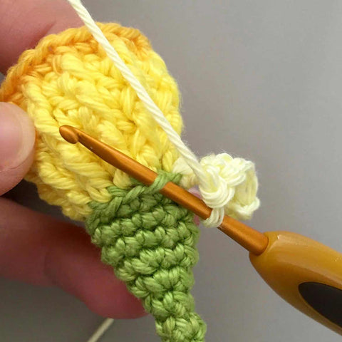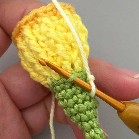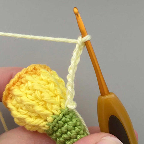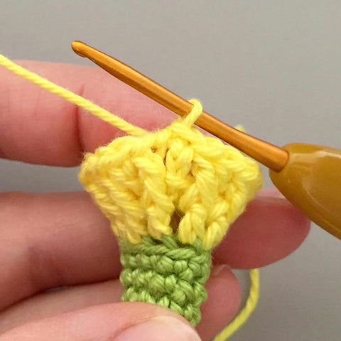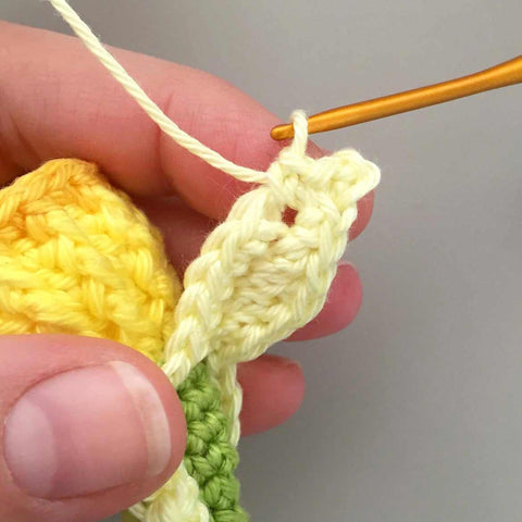 Gelb mit einer stehenden fM im das hinteren Maschenglied einer M der letzten Rd des Stiels aufnehmen. Die 3 Anfangs-LM einer Rd werden als 1 Stb gezählt.