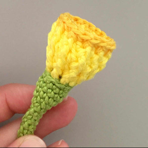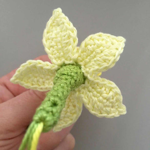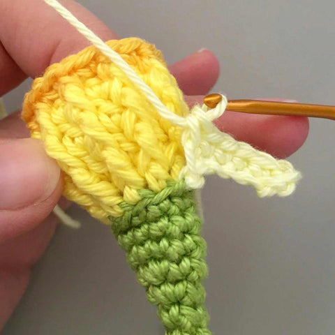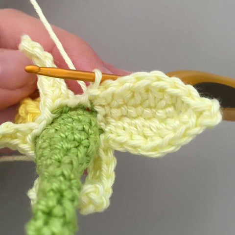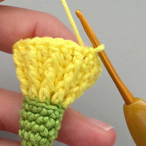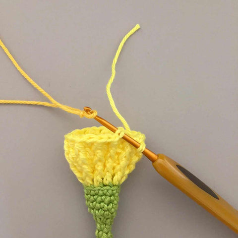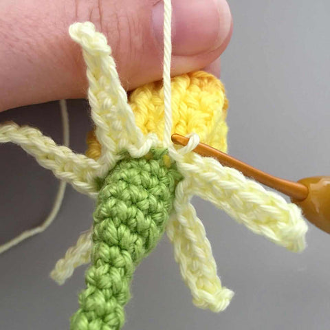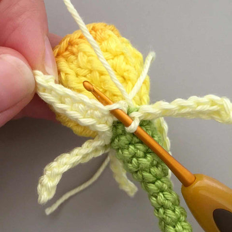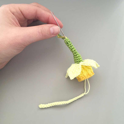 1 Ktm in die nächste M, Garn abschneiden und Rd unsichtbar schließen. Vernähe das Garnende im Inneren des Stängels.