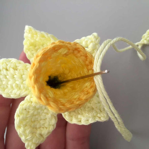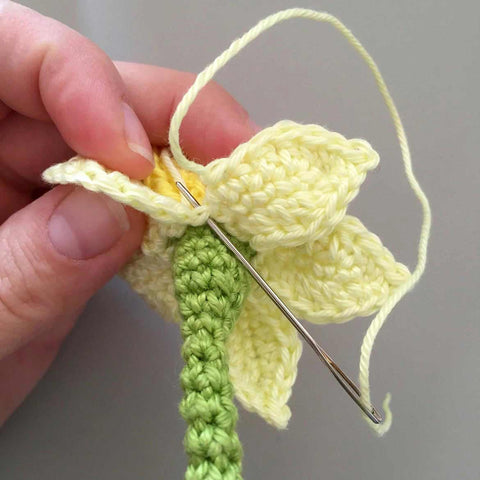 Garn abschneiden und Fadenende komplettg durch die letzte M ziehen und die Enden zusammenknoten. Die Garnenden auf eine Garnnadel fädeln und mit der Nadel in die Mitte der Blüte ein- durch den Hohlraum im Stängel und Mitte des Fadenringes am unteren Ende des Stängels wieder herausstechen.