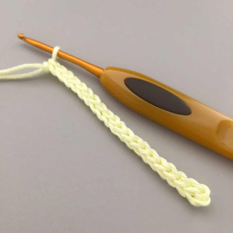 Luftmaschenkette mit 22 Lm in Blassgelb anschlagen. Beginnend in der 4. Lm neben der Nadel: 19 Ktm entlang der Lm-Kette.