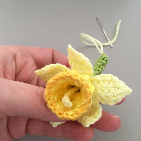 Garn abschneiden und Rd unsichtbar in die 1. M der Rd schließen. Alle Garnenden im Inneren des Blütenkelches vernähen.