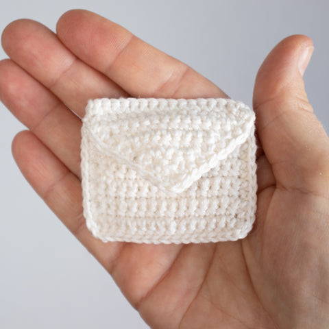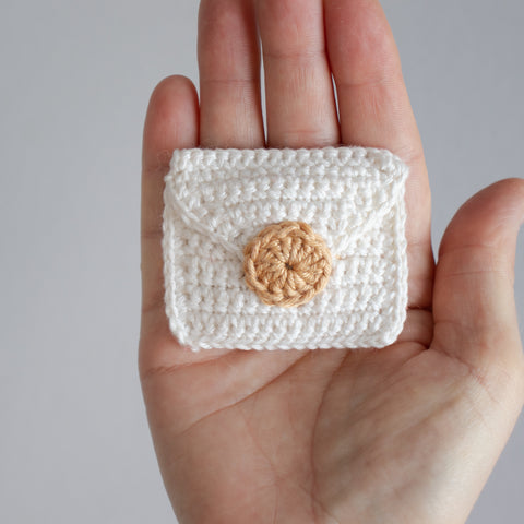 Garn mit einem langen Restfaden zum Annähen abschneiden und Rd unsichtbar ins erste Stb schließen. Zum Schluss das Siegel mit dem Garnende an den Brief nähen.