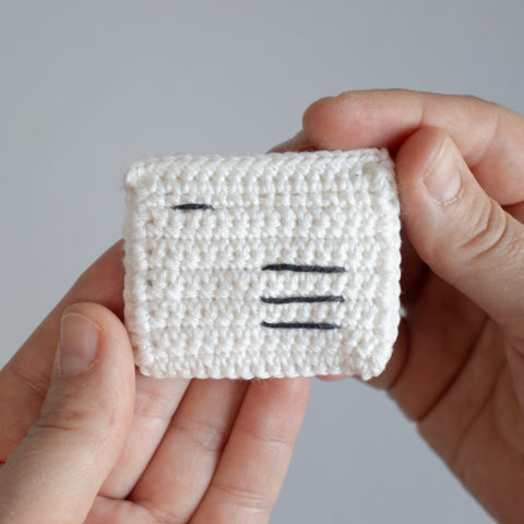 1 Lm, Garn abschneiden, Garnende komplett durch die letzte M holen und anziehen, um die Lm festzuziehen und die Reihe damit zu schließen. Häkel ein zweites Rechteck auf die gleiche Weise.