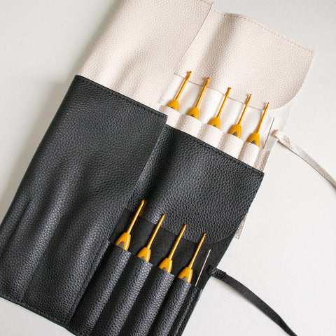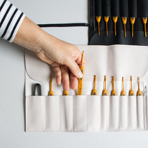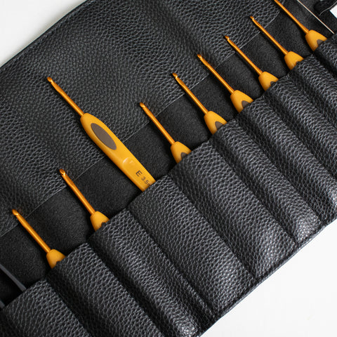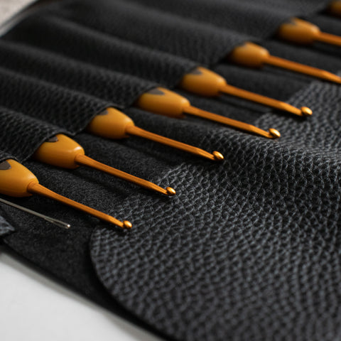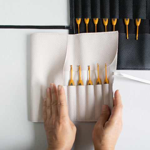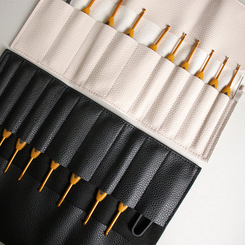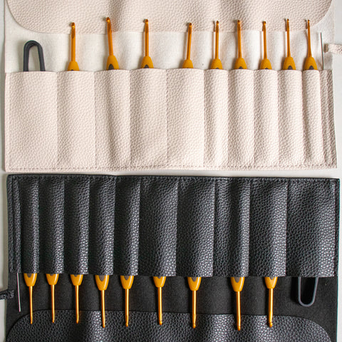 If you’re looking to elevate your crochet game, this set with it's lovely foldable etui that rolls up neatly, featuring a super soft faux leather surface is an absolute must-have. Available in classy black or minimalist creamy beige, it's not just practical; it's downright adorable!