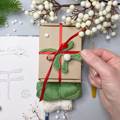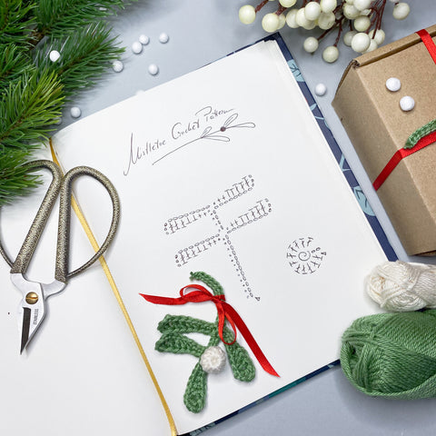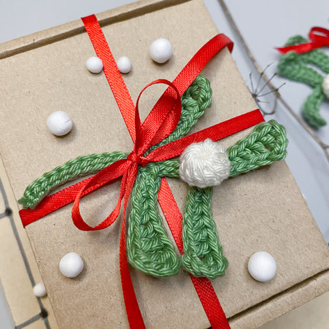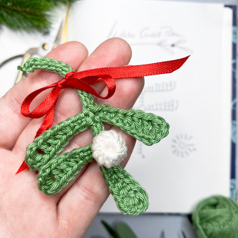 Using white, make a magic loop, ch 2, dc 11 into the loop. Cut the yarn and fasten the loop. Close the stitches through front loops and use the yarn tail to sew the berry onto the mistletoe.