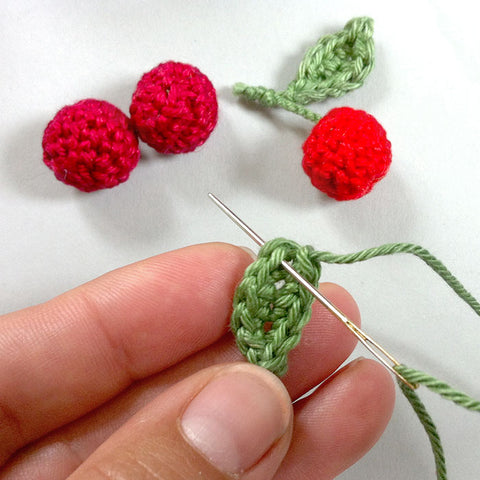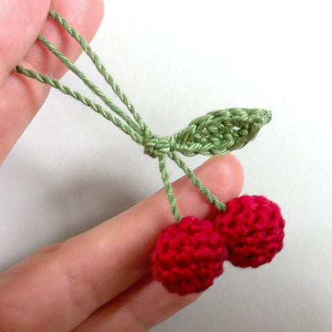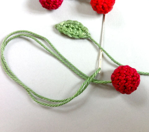 Once you've made a second cherry following the same instructions, hold together the cords of the two cherries and the yarn tail remaining on the leaf and tie them together with a knot (place the knot closely above the leaf).