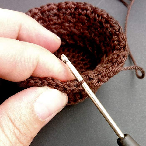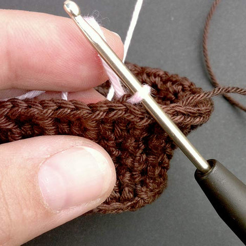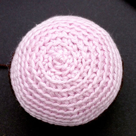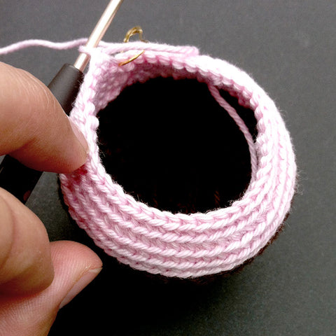 13. On the back side of the sts of the last rnd of the cup, join pink with a slip knot into any back bumb (→ photos 02-04), work into the back bumps: sc 52 (52)