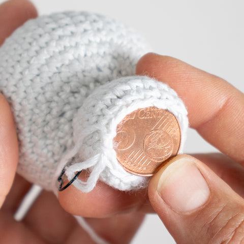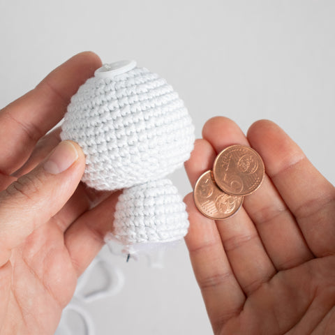 The head of the Kodama with the vibrating box inside is quite heavy, so that it is necessary to create a counterbalance that makes the Kodama sit securely without fall over too easily. To achieve this, insert two 5 Euro cent coins (or other coins of the right size) as a flat layer into the bottom (refer to gallery below).