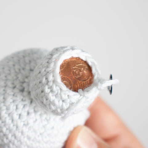 To find the right position for the eyes to be placed on the head mark tweo stitches between rnds 10 and 11 (counted top down) with a distance of 8-9 stitches between both pins. For an extra odd look, go one or more rnds up or down for the second eye.