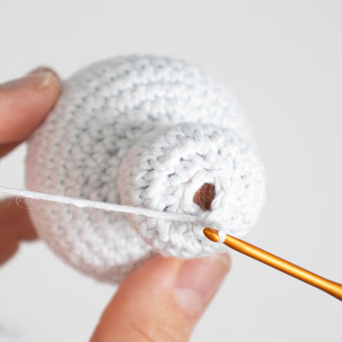Then, cut the yarn with a long rest and pull the end through the last stitch completely. The long yarn end will be used to sew the legs onto the body later.