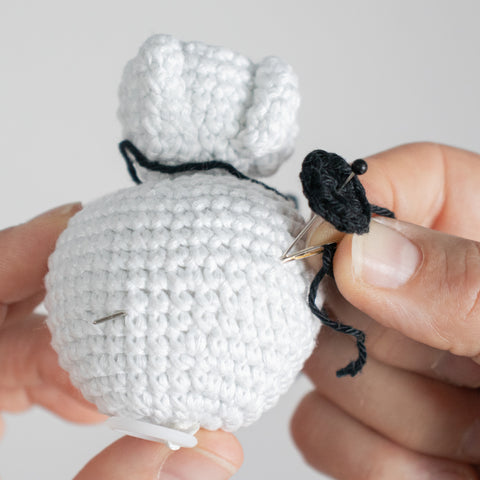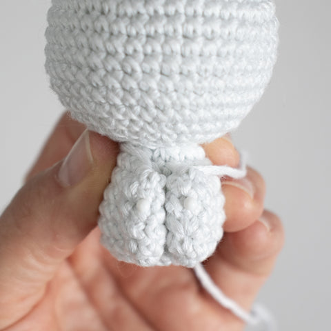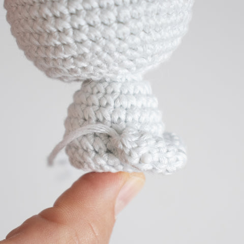 Sitting Kodama - Version 02: Use the yarn ends to sew the legs with their tip toes touching each other at the front of the Kodama's body. Sew through the tips and the end of the legs.