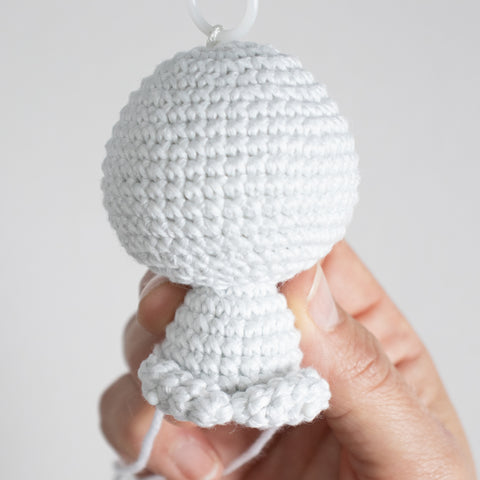 Standing Kodama: Use the long yarn end to sew the legs onto the left and right side of the body, between 3rd and 4th rnd counted bottom up. Weave in all ends.