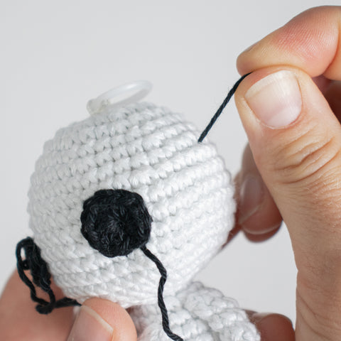 Use black yarn to make 2 eyes for your Kodama - one big and one small eye. Work the following stitches into a magic loop: