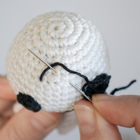 To make sure that the center of the eye keeps in place while sewing the eyes onto the head, thread a needle with the initiating yarn end first (this is the short end at the center of the eye remaining from the magic loop). Insert the needle into the marked stitch, run it though the soft stuffing, coming out through a stitch on the back, or side of the head. Pull the yarn tail. Now, use the long yarn end of the eye to sew the edge of the eye to the head.