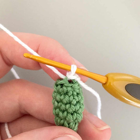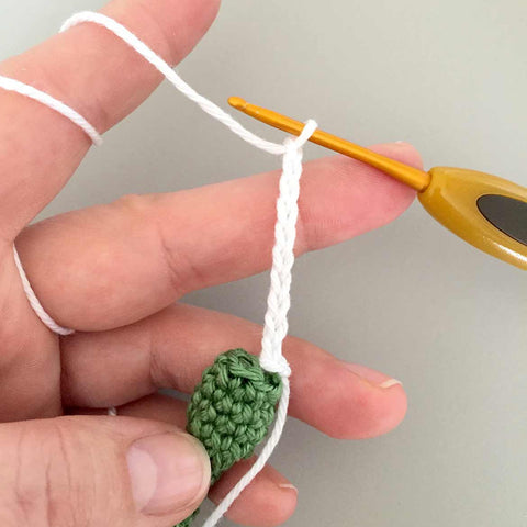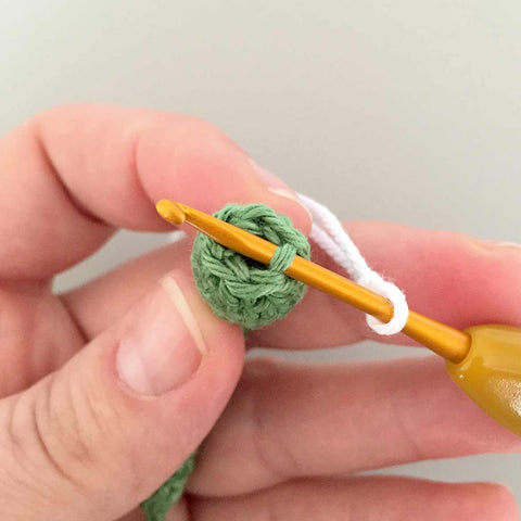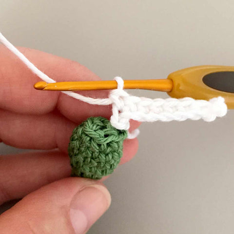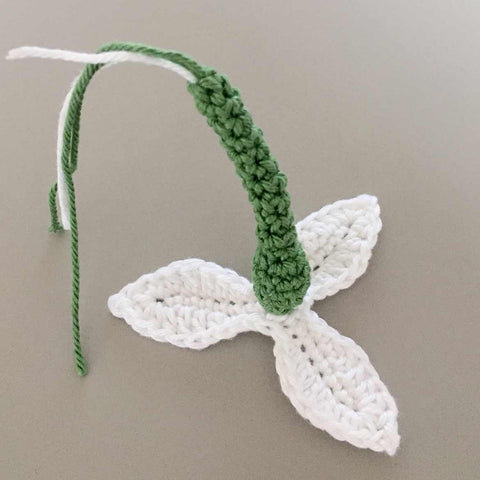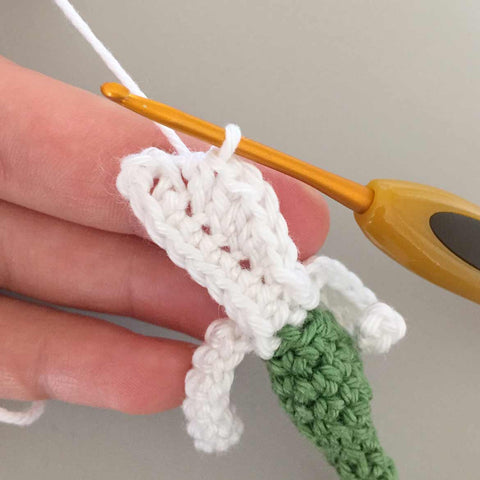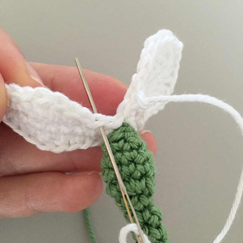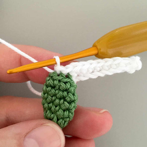 Cut the yarn with a long rest and pull the end hrough the last st completely. Use the remaining yarn tail to sew the leaf onto the stem.