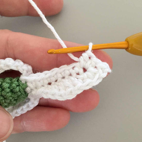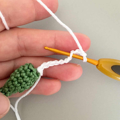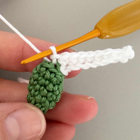 Make a foundation chain of 9 ch from green. Crochet long the chain, starting in 2nd ch from hook: slst 1, sc 2, hdc 2, sc 3.