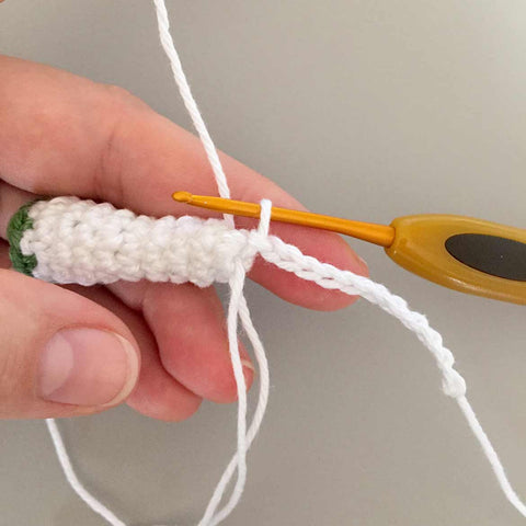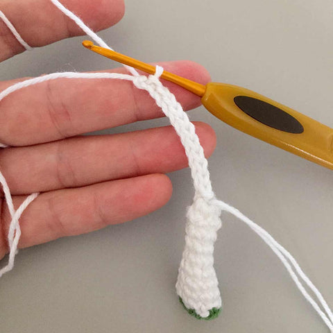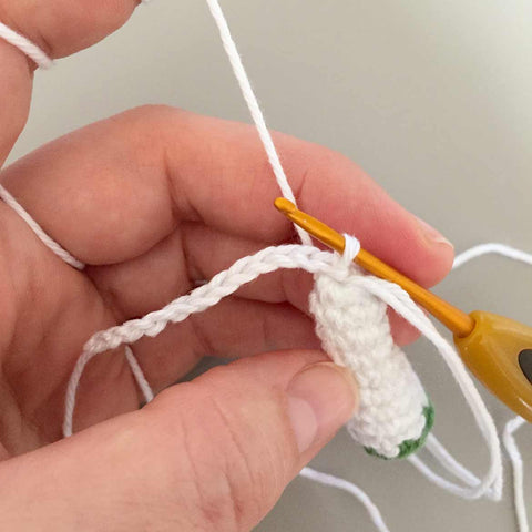 Make a foundation chain of 11 ch from white. Still holding the last loop on the hook, insert hook into the center of the magic loop at the bottom of the cup coming out above the 1st rnd, slst 1.
